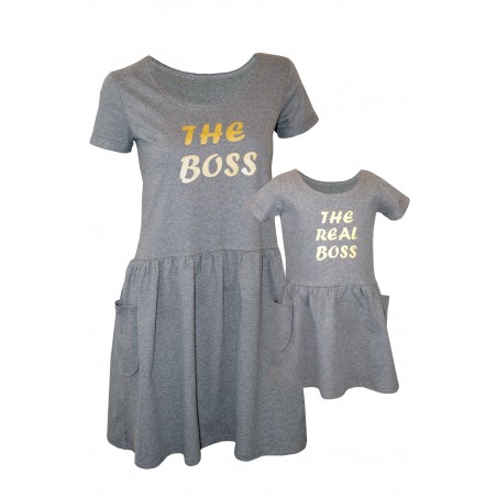 Set mama fiica, rochii lejere, realizate din bumbac usor elastic, cu imprimeu auriu, rezistent la spalare