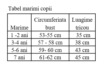 - lungime fusta copil - 1/2 ani - 27.5 cm, copil 3/4 ani - 31 cm, copil 5/6 ani - 36 cm, copil 7 ani - 39 cm