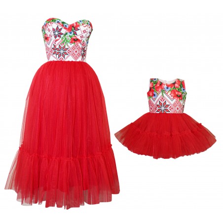 Rochie dama, confectionata din bumbac cu imprimeu traditional, tull si captuseala milaneza. Partea bustului este realizata din cupe push up incorporate, lungimea rochiei - midi