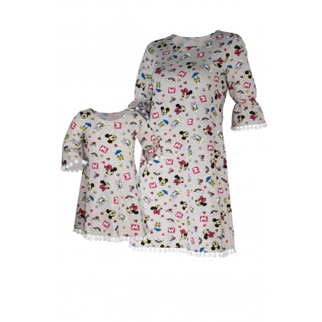Set mama/ fiica realizat din rochite gri cu imprimeu Disney si terminatie din ciucuri albi, maneca 3/4 usor bufanta